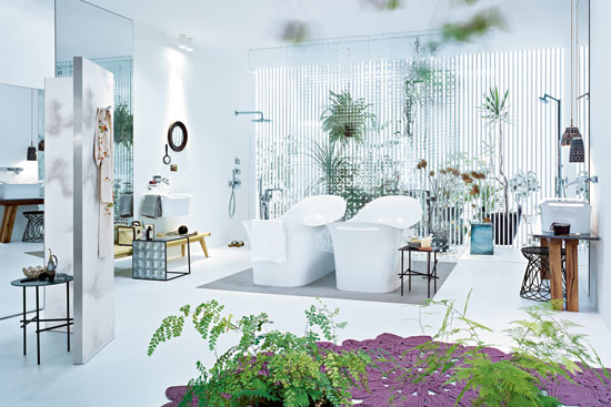 这间偌大的独立浴室,整个空间都是以明亮色调的白色打底,但丝毫没有让人感觉到单调,其中绿植的点缀起到了很大的作用。因为白色的简单,配搭起室内的装饰,相得益彰。中间两款流线造型的独立浴缸,适合你和伴侣在这里泡上一个美美的泡澡,在绿意盎然的环境中,享受无尽春色,有着时光静止的写意。