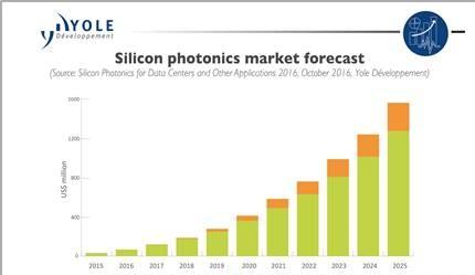 根据市场研究机构Yole 的数据,2015年全球硅光元件的市场规模还只有区区4000万美元,且拥有相关产品的公司不过Cisco, Intel, STMicroelectronics等寥寥几家。但到了2025年,预计硅光器件的市场规模将快速增长至15亿美元,2015至2025年均复合增长率高达45%,其中近90%用于数据中心。如前所述,微软、亚马逊和Facebook等互联网巨头之所以一直在大力推动该技术的发展,就是因为其数据中心每时每刻都在处理海量数据,其数据中心的性能被传统铜绞线数据传输带宽所限制。因此,这些互联网巨头希望硅基光电子技术能解决数据传输带宽问题从而提升数据中心的效率。短期内,硅基光电子芯片将被部署在高速信号传输系统中,替换现有的铜绞线。如Intel发布了传输速率可达100Gbps的光通讯芯片,它支持波分复用技术让不同的芯片可以在同一条光缆中同时工作而互不影响。此类设备适用于数据中心与超级计算机,解决基于铜线的传统互联性能不足问题。IBM、ST与NEC等主要芯片厂商也正在积极开发硅光子器件,国内也有不少公司在做硅基光通讯芯片,例如华为(之前收购了欧洲IMEC的硅基光电子芯片初创公司Caliopa)以及专注于CMOS光电子芯片的初创公司PhotonIC。