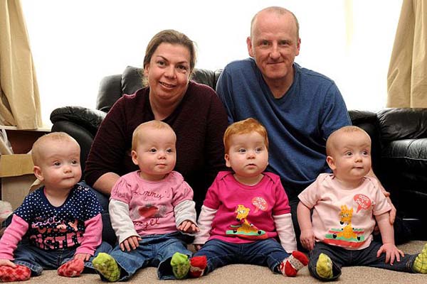 贾斯汀和克里斯汀夫妇俩经过九年的努力,终于通过试管婴儿,在去年的3月25日成功获得了四胞胎女儿。同时,这也是世界上首例同胚胎所生的四胞胎。刚出生时,四姐妹仅有10磅(约9.07斤)重。现在,14个月大的四胞胎姐妹非常健康,开始了她们在幼儿园的快乐生活。