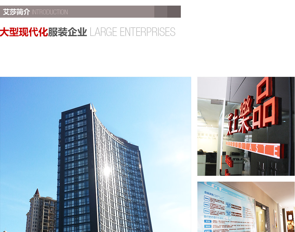 艾莎服饰有限公司是“香港艾上乐品(国际)时尚女装有限公司”在中国大陆地 区的唯一运营商。公司是一家主营高品位时尚女装的全面化服装公司。它集服装设计、生产加工、销售服务、运营管理于一身,致力于打造全方位的国际尖端时 尚服饰。从最初单一的服装加工慢慢发展壮大,开设设计.制造.销售等众多分部,至今公司发展日益完善和成熟,并且在艾莎全体工作人员不懈努力下,公司愈 加强大,在品牌女装界拥有不可替代的一席之地。