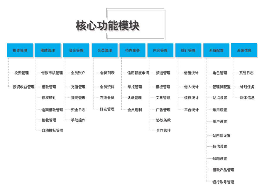 主流借贷系统的功能和特性,支持抵押标、信用标、优选理财计划、流转标等各类主流标种。内置多种智能化功能,自动投资、自动还款、自动生成财务报表等,使投资理财变的轻松容易,管理变得简单高效。支持第三方支付,实现用户即时充值与提现