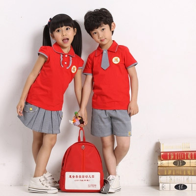 幼儿园园服新款学院风红色喜庆套装假领带短袖上衣加千鸟格百褶裙