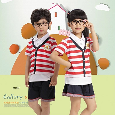 夏季丘比熊纯棉红白条纹假两件幼儿园园服校服批发