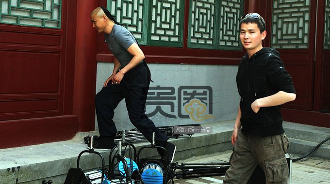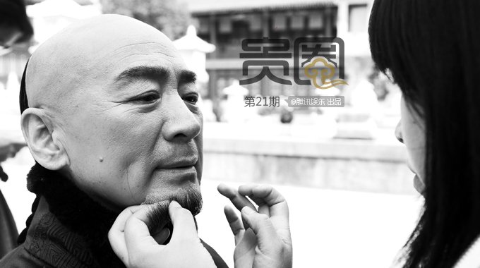 出汗多,一些小妆容需要随时修饰,一位女助理在帮寇振海现场粘胡子。
