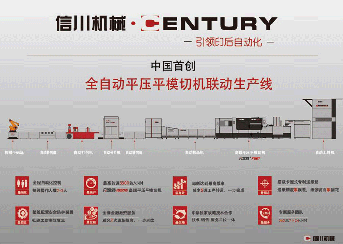 信川胶印联动生产线,是中国首条印后平压平模切机联动生产线,它将自动上料、平压平模切、分片、检品、打包、机器人码垛、机器人缠绕等工艺智能联合起来,同时与意大利、德国、英国等多家知名制造商达成战略合作协议,以满足水印、预印、彩印等多种产品的包装需求,实现了产业自动化,成为全球领先的印后设备整体方案提供商。