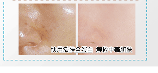 | 顾客感言:经常熬夜对皮肤不好,有了活肤金蛋白,一切问题迎刃而解。既能享受贪玩乐趣又不让肌肤受到损伤,跟痘痘、粉刺彻底说BYE-BYE |