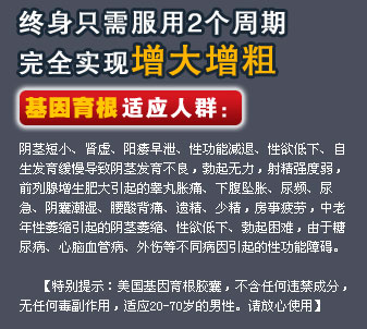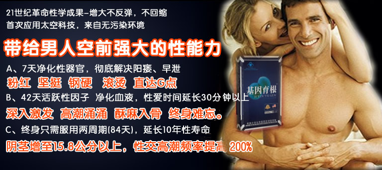 基因育根胶囊中独有的太空基因核磁因子进入男性器官后,最终有效完成海绵体细胞的基因重组,器官达到恒定增长,睾丸活力增强,男性器官的长度增加4—7厘米,粗度增加2-3厘米,硬度提高50%,持久力,耐磨檫力,抽动频率的刺激度,性快感,灵敏度,性欲望等24个男性性福指标显著提高,90%的人可达到18cm的理想尺寸,龟头转为健康的红色,体力精力、活力耐力全面提升,让你始终保持在一种巅峰的状念,随心所欲、快乐胀大,让你体验到前所未有的性快感,而女人也会因为你硕大粗壮,坚挺胀热的性器官而陶醉不已,强烈刺激的灼烧感遍布全身.享受高潮迭起的性福快感。