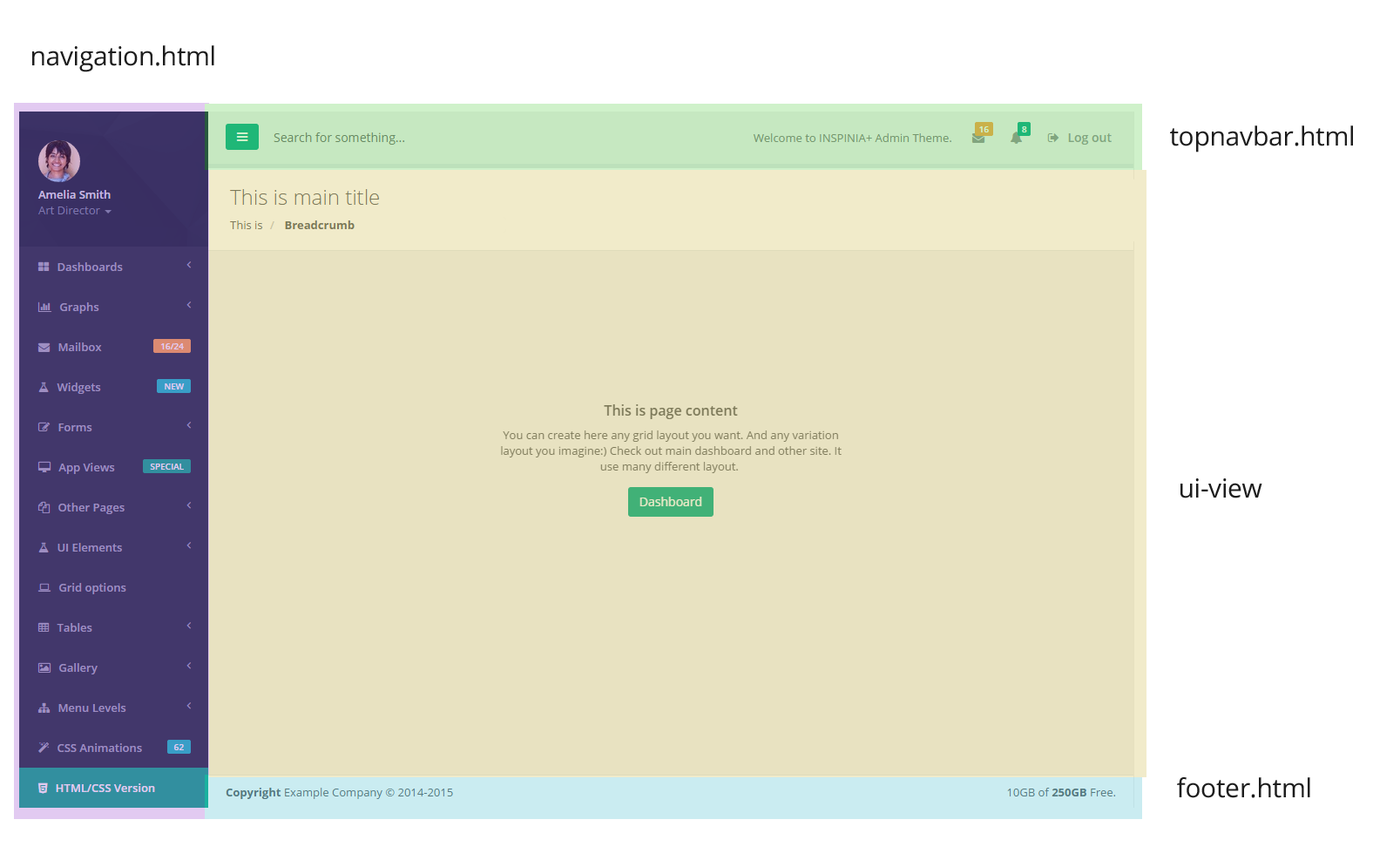<div ui-view></div> to allow create diferent layouts pagemorrisChartCtrl controller. Add translateCtrl and imageCropfancyBox and morris directives. Change sideNavigation directive and add $timeout function for metsiMenu.Contact as with email: support@webapplayers.com